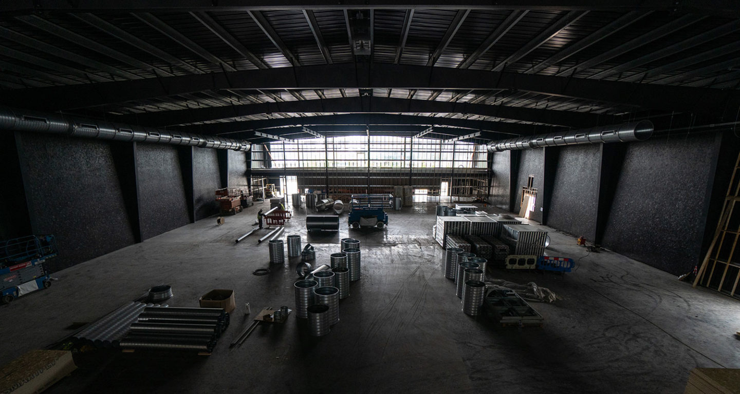 Since the last video release, there has been incredible progress on-site; the steel skeleton of the building has been erected, the black concrete floor slab has been poured, the OSB wall linings are up and being painted, the glass window panes have been fitted and the external black sawtooth cladding is in place.