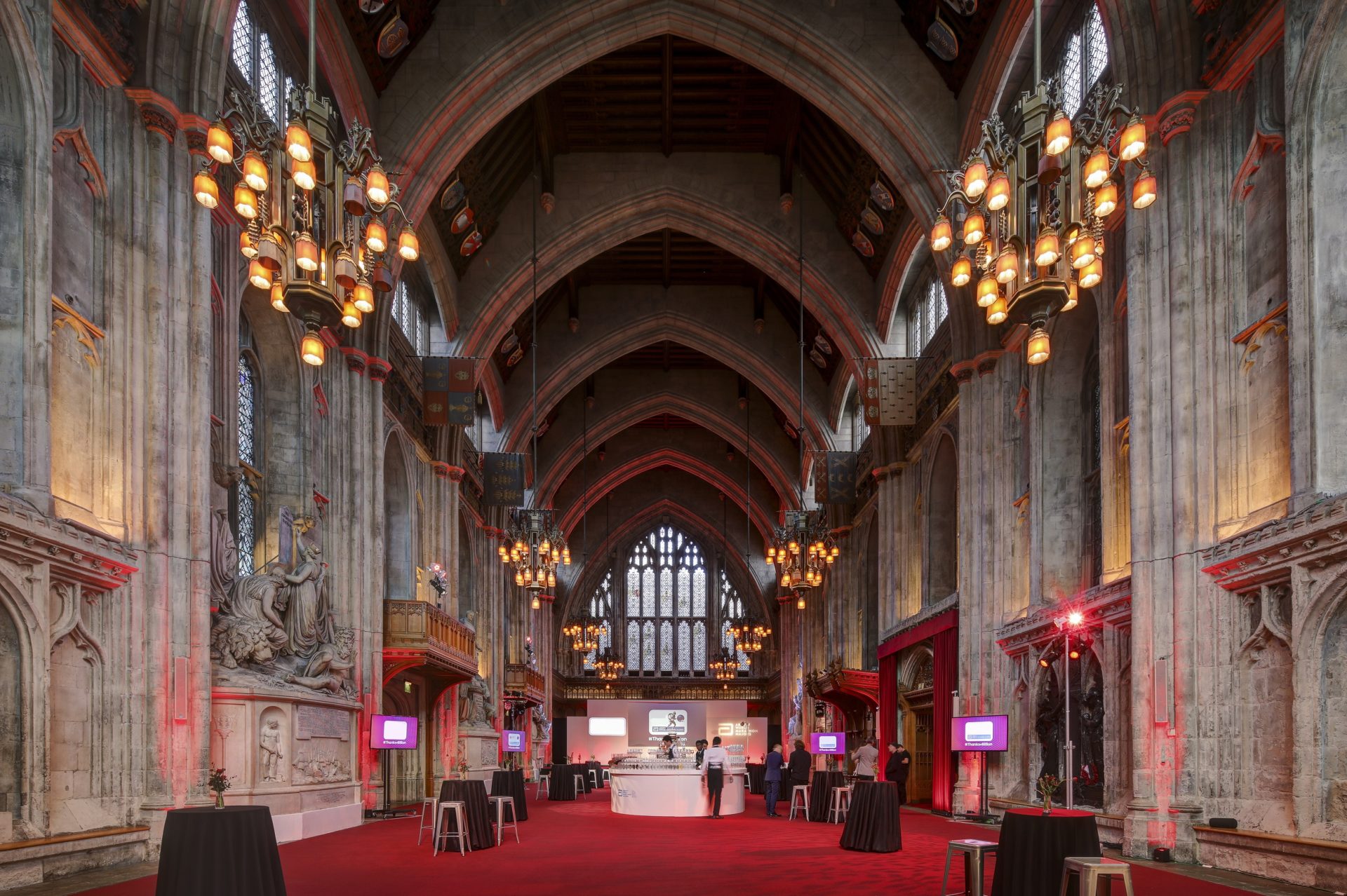 The Great Hall is a beautifully vast space with soaring, high-arched ceilings and stunning Gothic features. Its unmistakable and evocative style means natural daylight floods in at each end of the space through the two huge stained glass windows, showcasing the twelve great Livery Companies and monuments of Britain’s national heroes.